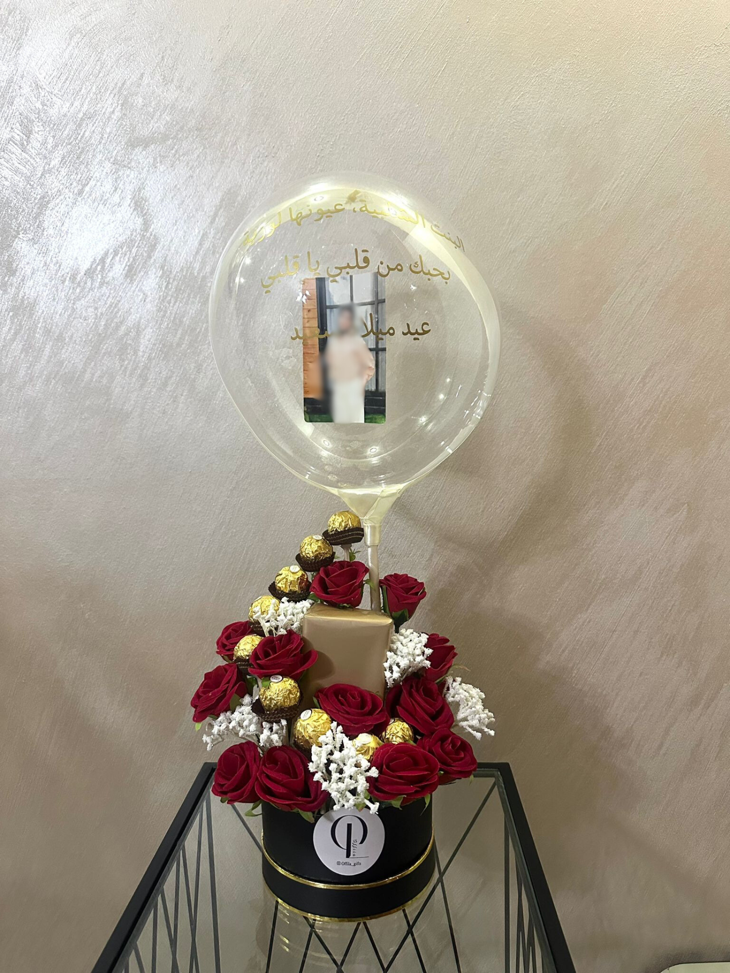 هدية بتصميم جدًّا مميز، مضمون الهدية بوكس مليئ بالورد (اصطناعي) وشكولاطة الفريرو على شكل درج