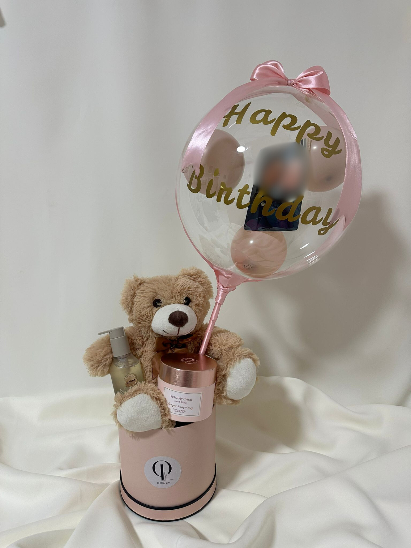 فيها دبدوب لطيف، كريمات جسم حسب الطلب، وبالون شفاف عليه عبارة من اختيارك وصورة حسب الطلب